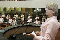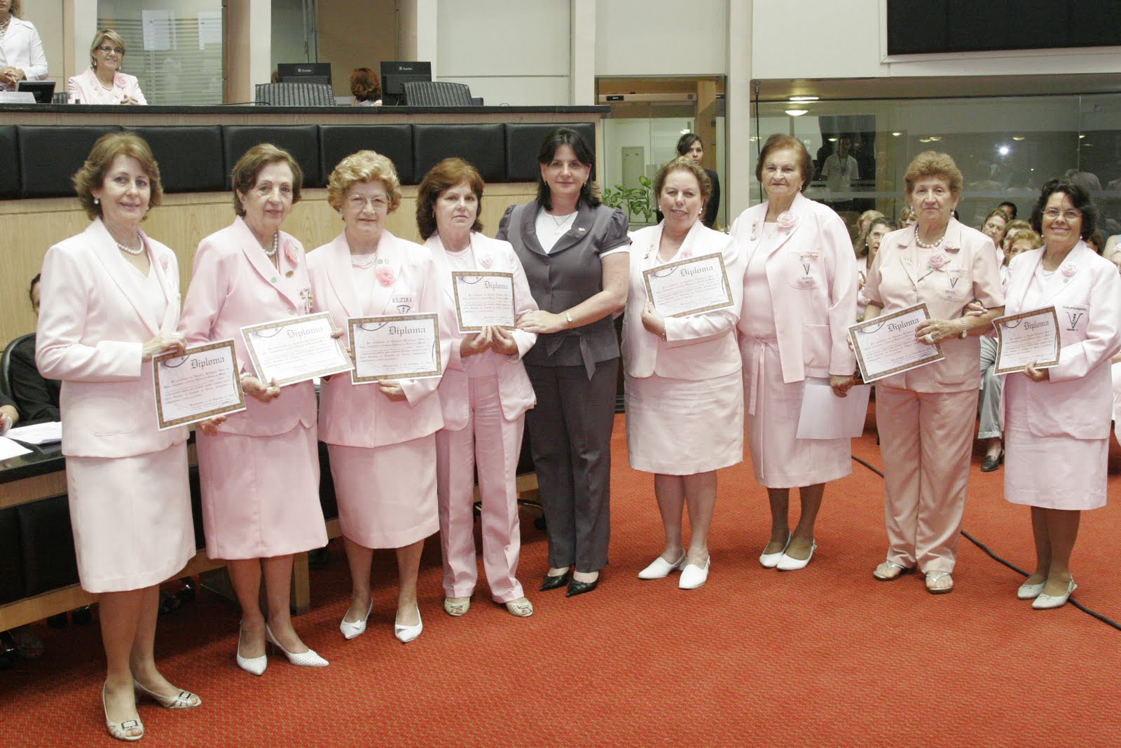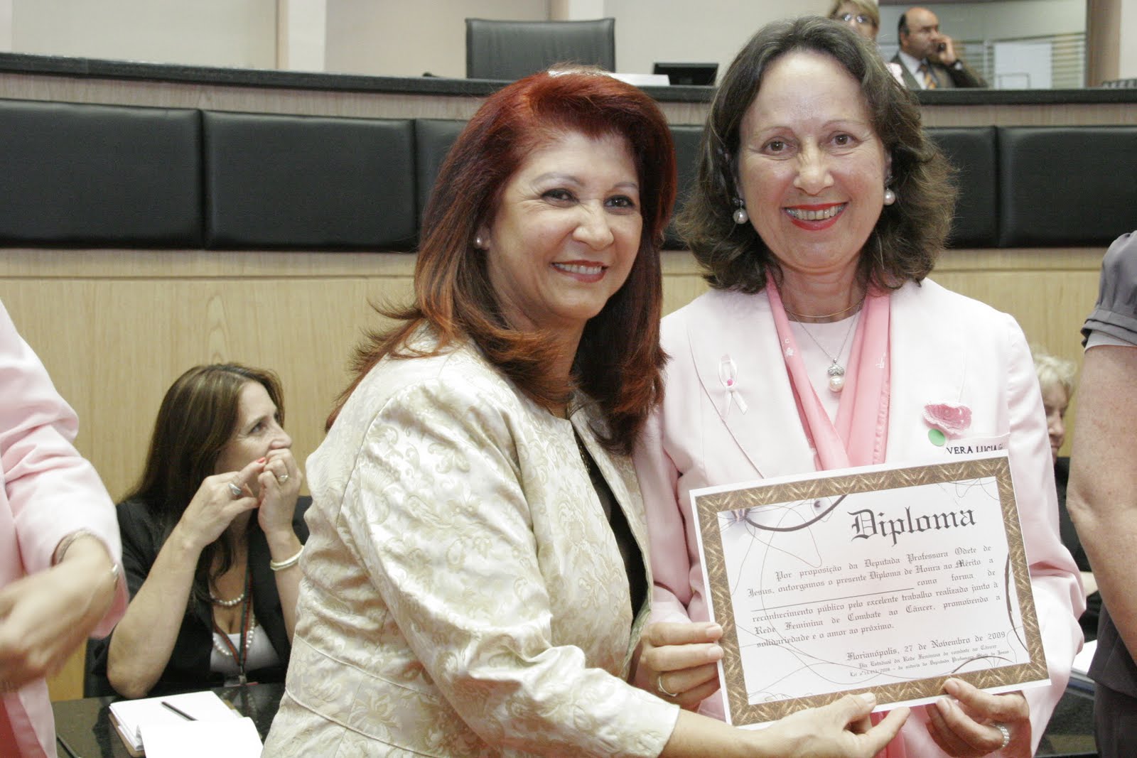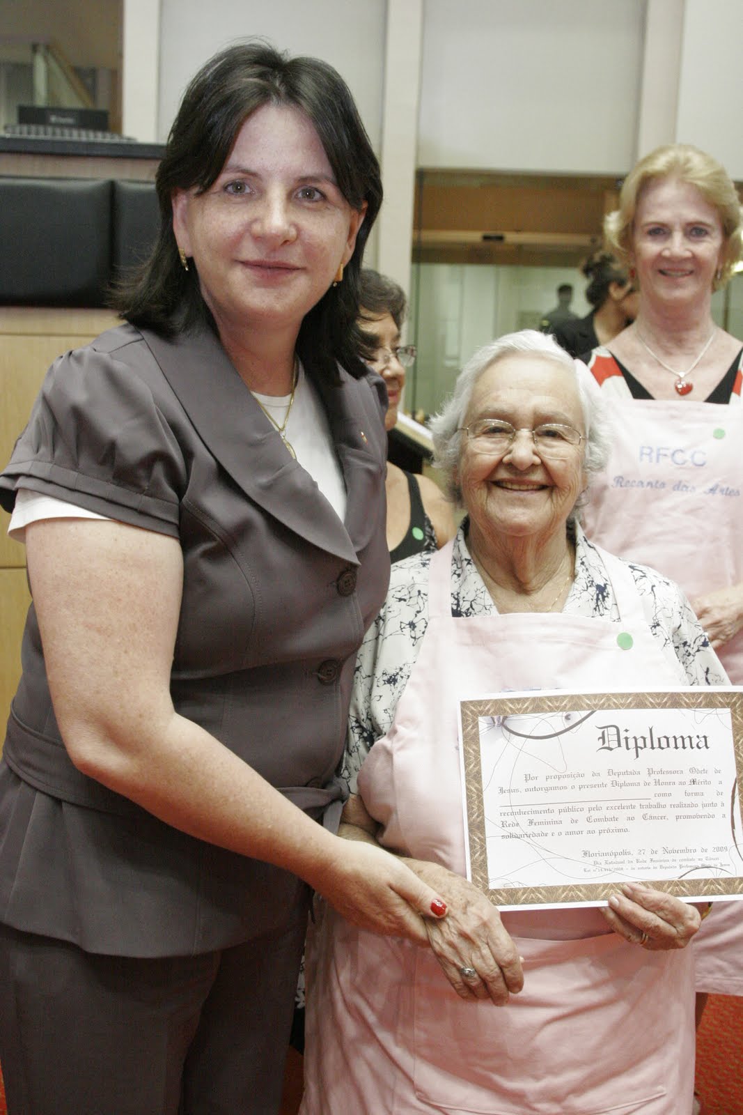 Durante a solenidade, a presidente da RFCC de Santa Catarina, Aglaê Nazário de Oliveira, recebeu uma placa em nome do Parlamento catarinense, simbolizando o reconhecimento e a gratidão pelo trabalho prestado no estado. “Diante de um índice alto, onde 30% das mulheres, entre 30 e 40 anos, estão acometidas pelo câncer, faço um apelo para que as mulheres usufruam da Lei nº 11.664/08, que assegura o direito ao exame gratuito mamografia, a partir dos 40 anos, oferecido pelo Sistema Único de Saúde (SUS)”, ressaltou Aglê.